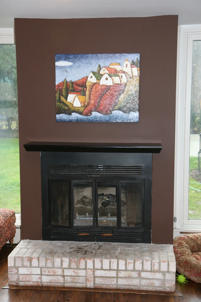 The existing dark brown drywall surround created a narrow, outdated appearance disconnected from the room's overall design. The small black mantel shelf and basic painted brick hearth showed visible wear and lacked cohesion with the wall treatment. The result was a fireplace that detracted from rather than enhanced the room's aesthetic appeal.